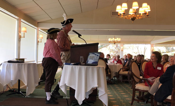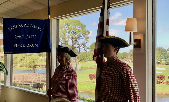 On Saturday, the Treasure Coast Fife & Drum Corps had the privilege of performing for the Halpatiokee Chapter of the DAR at their luncheon in honor of George Washington’s birthday. The event was held at the prestigious Mariner Sands Country Club. Seven of us (Georgianna, Martha, Jackie, Nathan, Kristie, Linda and myself, Bill) played a variety of tunes including Welcome Here Again and Battle Hymn of the Republic. We also played the National Anthem and My Country Tis of Thee while the guests sang along. Before marching off, we gave an enthusiastic trio of huzzahs to the guests!