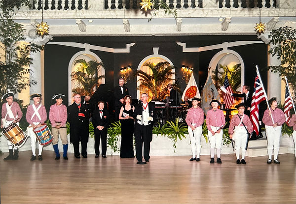 Members of the Society of Colonial Wars from across the country gathered for a dinner dance at the Everglades Club in Palm Beach on February 6th. The Society advocates the importance of colonial events and individuals that shaped America. As guests arrived, we formed ranks on either side of the entrance walkway and played tunes. Later we led the Society’s dignitaries to the stage.